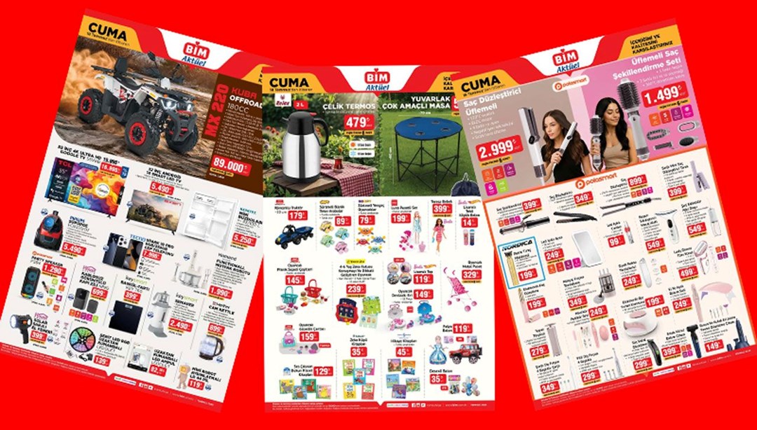 BİM’de bu hafta elektronik mutfak ürünlerinden, şaç şekillendirici aletlere, tencereden, tabak setine, televizyondan, elektrikli diş fırçasına onlarca farklı ürün reyonlarda yerini almaya hazırlanıyor. Geniş ürün yelpazesi dikkat çekerken kataloğun merakla beklenen 180 CC Off Road ATV ise 89.000 TL’den satışta olacak. Yuvarlak Çok Amaçlı Masa 539 TL, Çelik Termos 539 TL, İzolasyonlu Çanta 369 TL, Piknik Hasırı 219 TL, Kilim 189 TL, Bavul Düzenleyici Organizer 449 TL, Çift Kişilik Lastikli Çarşaf 195 TL, 4 Parça Pasta Tabağı Seti 499 TL, Sepet 219 TL, Ekmeklik 179 TL, Kırlent Kılıfı ise 189 TL’den satılacak. Peki BİM’de bu hafta neler var? İşte, BİM Aktüel Kataloğu 18 Temmuz cuma…