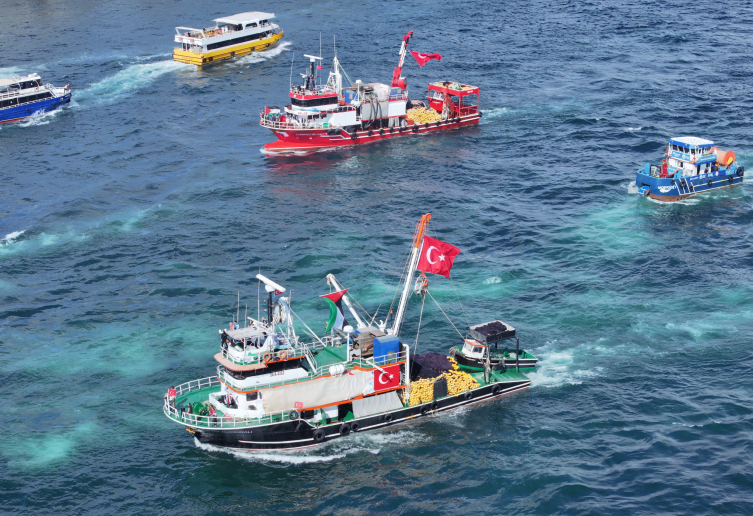 Enez limanında buluşan 60’a yakın tekne ve bot, Filistin bayrakları eşliğinde denize açılarak, Gazze halkının ve filodaki aktivistlerin yanında olduklarını göstermek amacıyla tur attı.